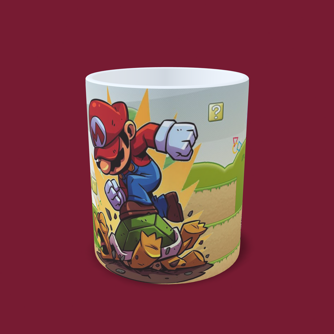 Caneca personalizada com ilustração exclusiva inspirada no universo de Super Mario. Estampa vibrante de alta resolução, trazendo o personagem Mario em uma cena dinâmica, saltando sobre um casco de tartaruga em cenário clássico de plataforma, com detalhes como blocos de interrogação e elementos do jogo. Ideal para fãs de games e cultura pop, esta caneca é perfeita para presentear ou colecionar, além de trazer mais diversão ao seu dia a dia. Fabricada em material resistente e acabamento de qualidade, pode ser utilizada tanto para bebidas quentes quanto frias.